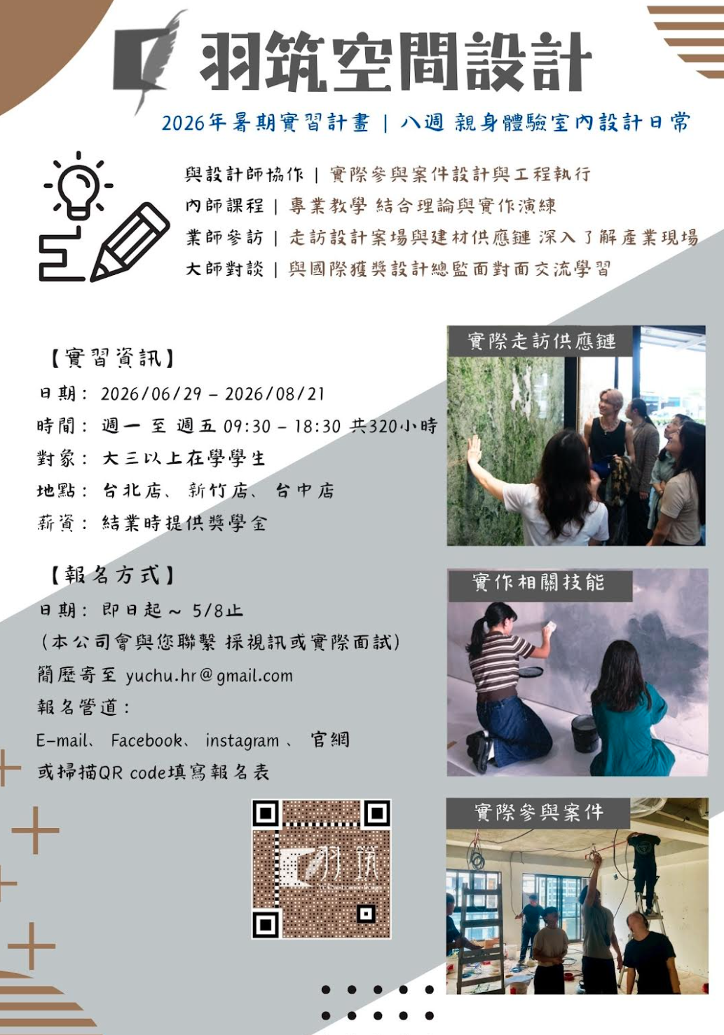 2026年 羽筑暑期實習計畫招募中! - 羽筑空間設計 2026 暑期實習,提供親身體驗、實際操作的學習環境,深入了解設計師的工作!這不只是實習,更是一場全方位職業探索— 這是充滿探索、學習與成長的機會,我們誠摯期待並歡迎各位學生們的加...
