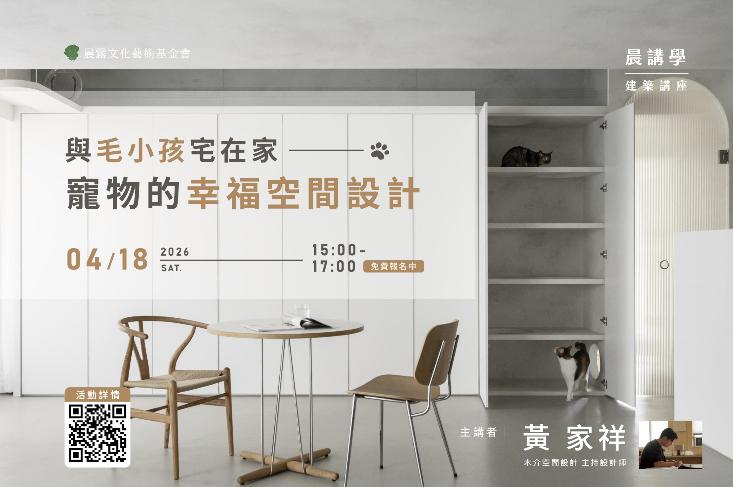 從人居到寵居:誠邀師生參與「人寵共生」空間專題講座 - 隨著台灣人口結構變遷,寵物數量已正式超越 14 歲以下幼兒總數。「人寵共生」及「寵物友善空間設計」已成為當代建築與室內設計領域中,最具潛力且深受關注的新興議題。本次特別邀請到 木介...