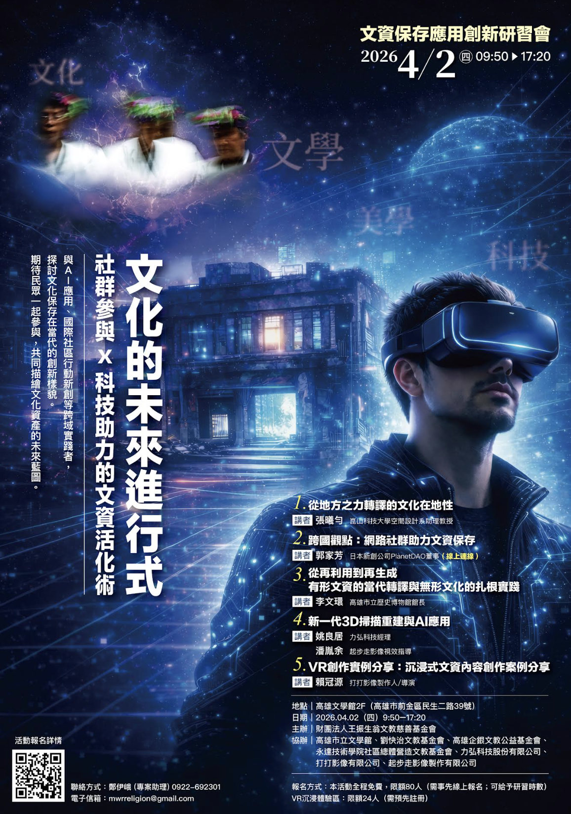 文化的未來進行式~文資保存應用創新研習會,歡迎參加! - 在瞬息萬變AI網路時代來臨之際,當今如何讓文化資產與數位科技的相遇,成為雙贏的創新前景。王振生翁文教慈善基金會長期致力推動藝術人文發展與文化傳承 。今年迎接新時代新趨勢,以推動...