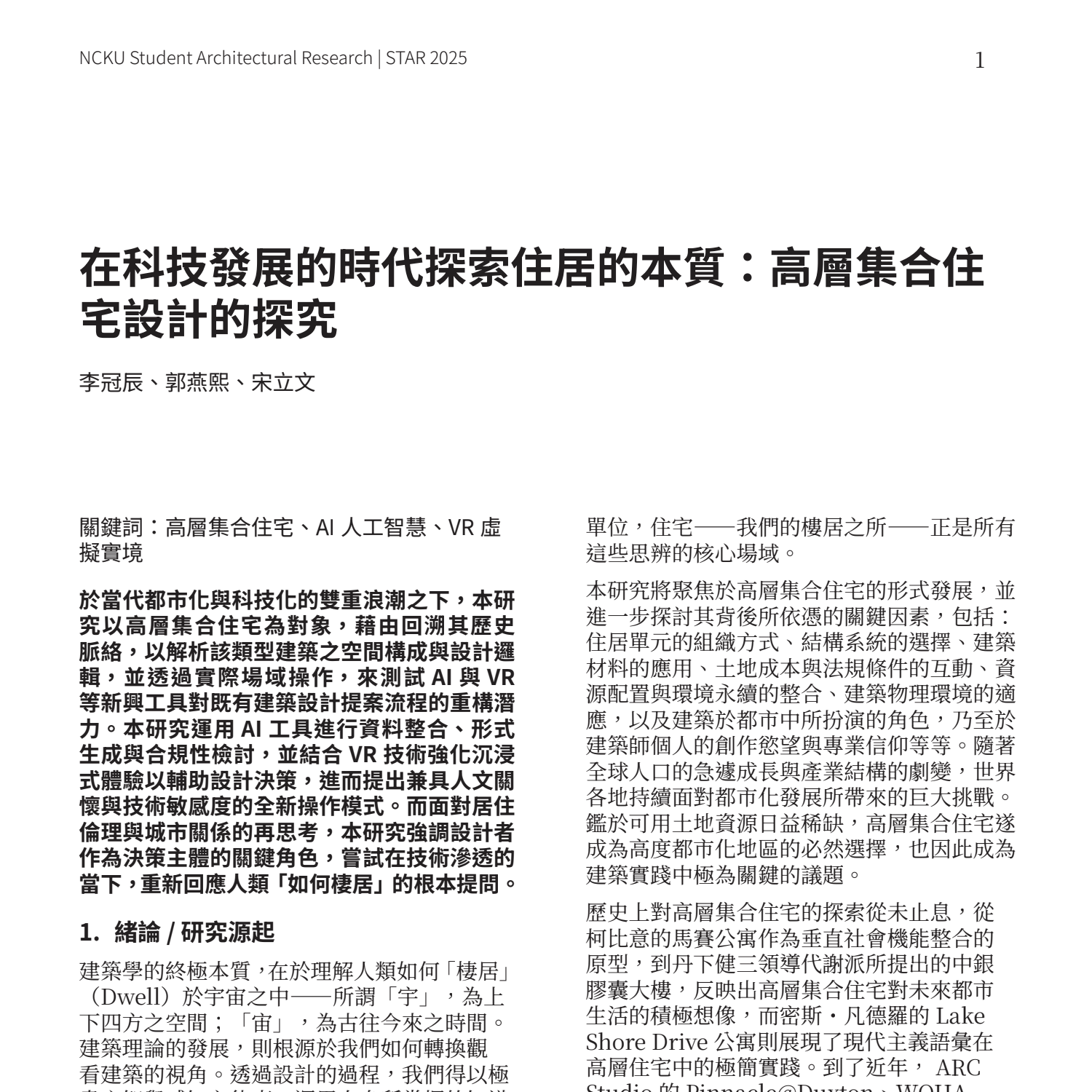 關鍵詞 : 高層集合住宅、AI 人工智慧、VR 虛擬實境 摘要: 於當代都市化與科技化的雙重浪潮之下,本研究以高層集合住宅為對象,藉由回溯其歷史脈絡,以解析該類型建築之空間構成與設計邏輯,並透過實際場域操作...