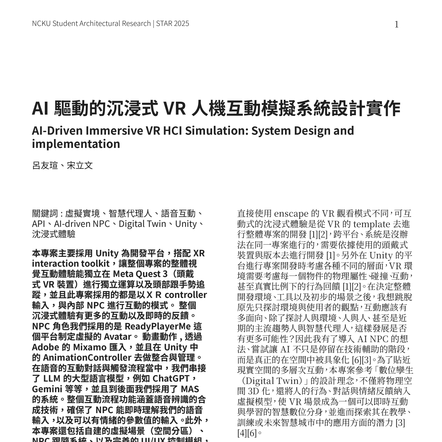 關鍵詞 : 虛擬實境、智慧代理人、語音互動、 API、AI-driven NPC、Digital Twin、Unity、沈浸式體驗 摘要: 本專案主要採用 Unity 為開發平台,搭配 XR interaction toolkit,讓整個專案的整體視覺互動體驗能獨立在 Meta Quest 3(頭戴式 V...